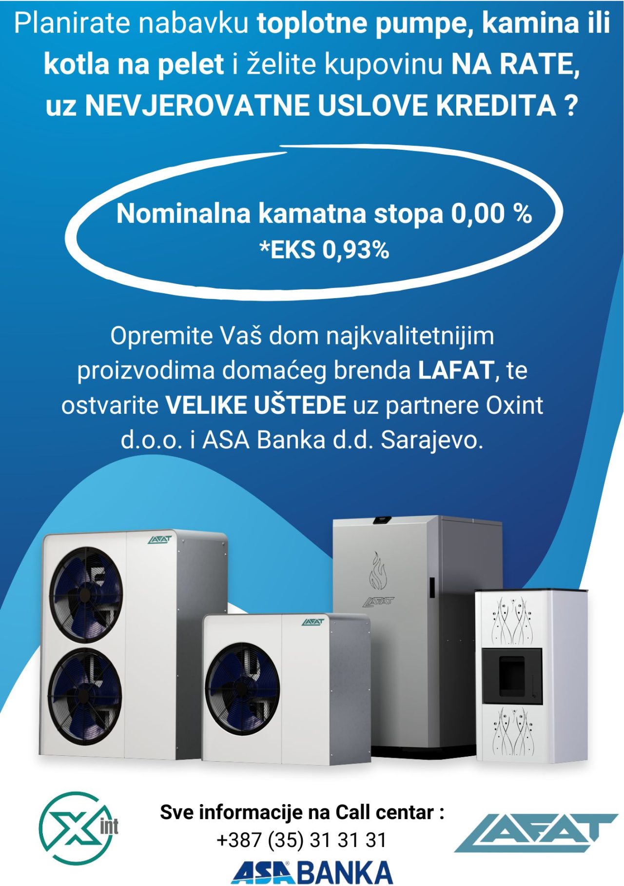 Namjenski kredit max. iznosa do 15.000,00 KM i rokom otplate od 60 mjeseci, putem Oxint d.o.o. i ASA banka d.d., omogućena Vam je kupovina nekog od ekološki prihvatljivih proizvoda, iz asortimana domaćeg brenda LAFAT :